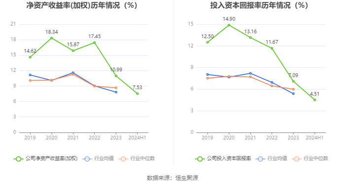 盈利能力方面, 2024年半年度公司加权平均净资产收益率为7.53%,同比上升1.03个百分点。公司2024年上半年投入资本回报率为4.51%,较上年同期上升0.49个百分点。