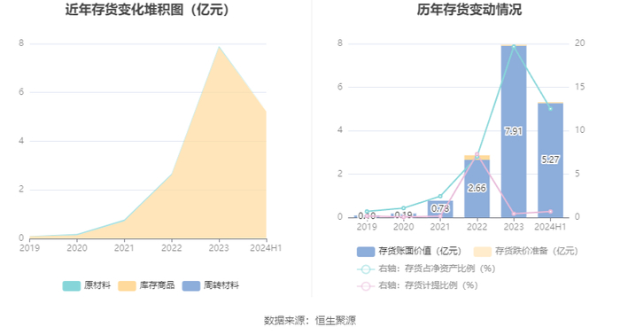 从存货变动来看,截至2024年上半年末,公司存货账面价值为5.27亿元,占净资产的12.52%,较上年末减少2.65亿元。其中,存货跌价准备为378.47万元,计提比例为0.71%。