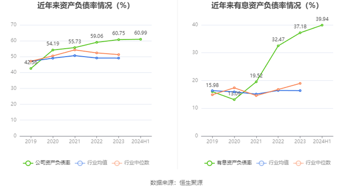 在偿债能力方面,公司2024年上半年末资产负债率为60.99%,相比上年末上升0.24个百分点;有息资产负债率为39.94%,相比上年末上升2.76个百分点。