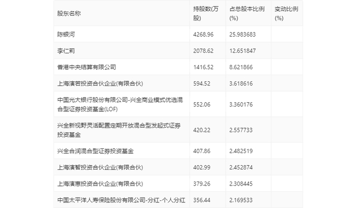 半年报显示,2024年上半年末公司十大流通股东中,新进股东为中国光大银行股份有限公司-兴全商业模式优选混合型证券投资基金(LOF)、兴全新视野灵活配置定期开放混合型发起式证券投资基金,取代了一季度末的中欧时代先锋股票型发起式证券投资基金、北京君联茂林股权投资合伙企业(有限合伙)。在具体持股比例上,兴全合润混合型证券投资基金持股有所上升,陈银河、李仁莉、香港中央结算有限公司、上海演若投资合伙企业(有限合伙)、上海演智投资合伙企业(有限合伙)、上海演惠投资合伙企业(有限合伙)、中国太平洋人寿保险股份有限公司-分红-个人分红持股有所下降。