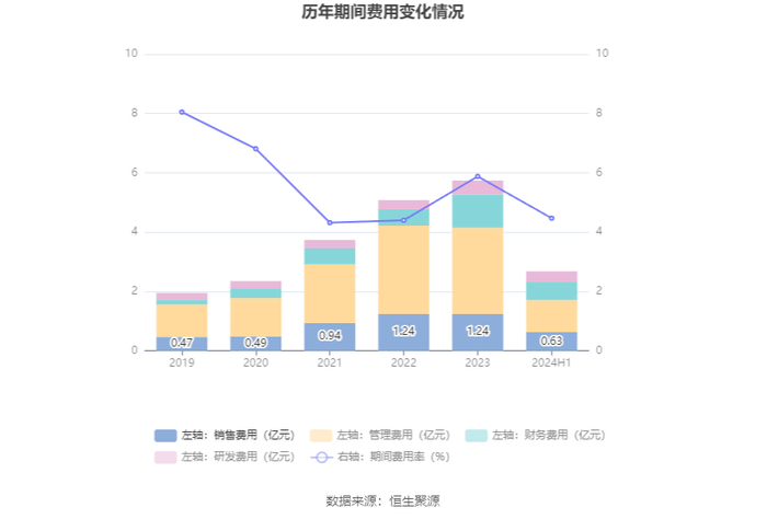 2024年上半年,公司期间费用为2.68亿元,较上年同期增加1600.05万元;但期间费用率为4.47%,较上年同期下降1.09个百分点。其中,销售费用同比增长9.45%,管理费用同比下降25.15%,研发费用同比增长82.71%,财务费用同比增长99.46%。