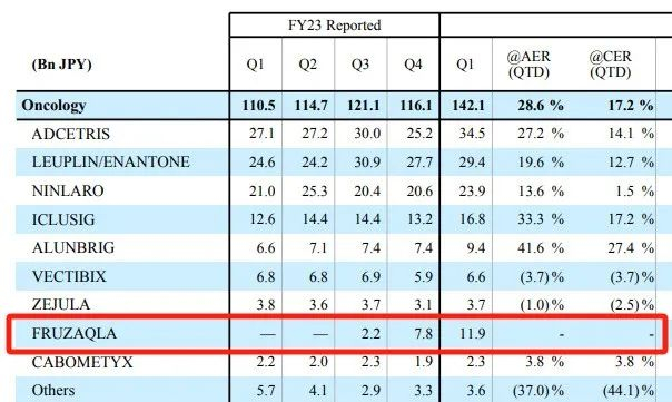 呋喹替尼去年11月在美国获批的,商业化由武田负责,获批两天就开出了首张处方。在武田的肿瘤药物版块里,呋喹替尼销售额并不算多但增速最快,销售收入上大有挑战武田第一抗癌药维布妥昔单抗营收的实力。
