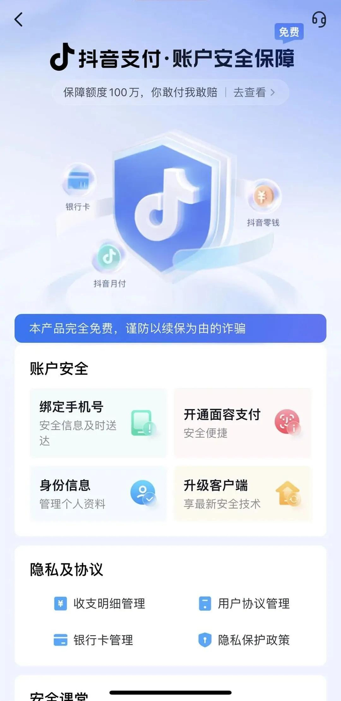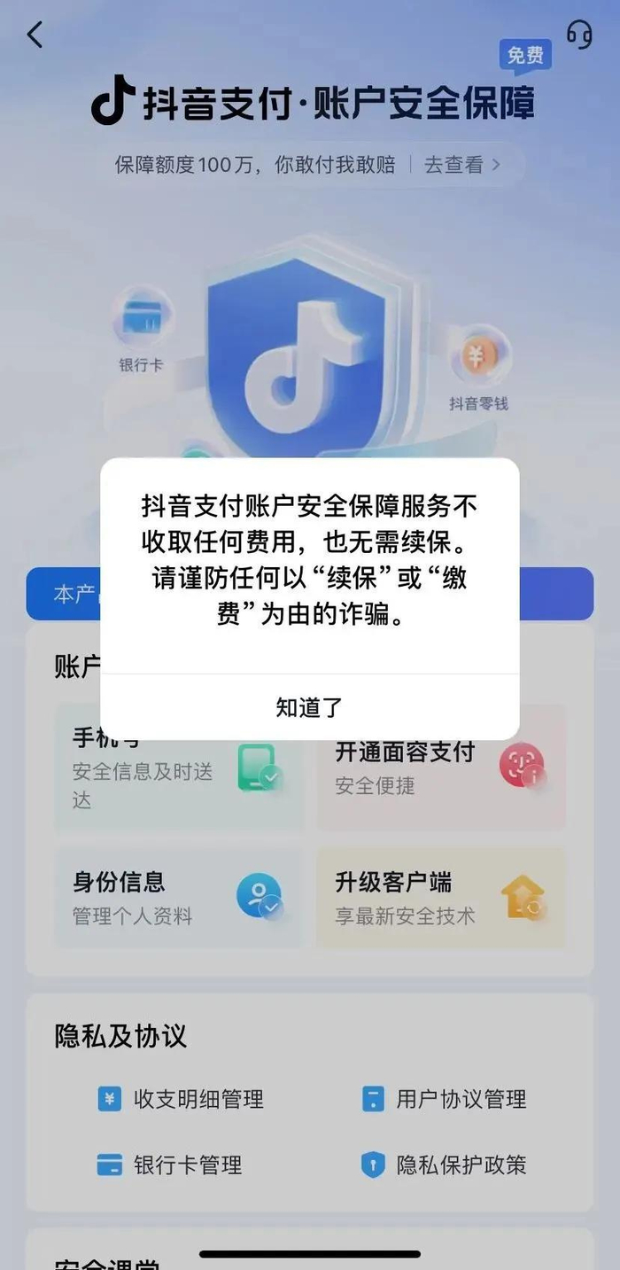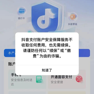 抖音安全中心提醒大家,上述骗局实际上是假冒抖音支付推出的“百万保障”的名义来施行诈骗。早在2021年4月,抖音支付为用户免费提供一项账户安全保障,用户的抖音支付(包含零钱、银行卡、抖音月付)账户如果被他人盗用而产生资金损失,平台承诺按损失金额不限次赔付,每年赔付金额累计最高100万元(俗称“百万保障”)。该项保障不收取用户任何费用,也无需续保,长期有效。