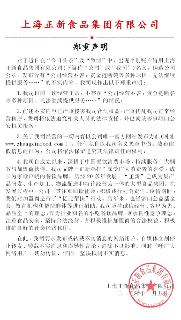 后续,正新鸡排还曾在其社交帐号上发文,对于今日头条及微博中个别账户冒用上海正新食品集团有限公司名义,伪造公司公章,发布含有“公司经营不善,资金链断裂等多种原因,无法继续提供服务……”的不实内容进行郑重声明。天眼查显示,正新食品系上海正新食品集团有限公司旗下品牌。