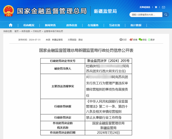 周三,监管文书披露,杜娟(时任某大行阿克苏兵团支行西大街支行主任)、杜泓艳(时任某大行阿克苏兵团支行营业部大堂经理),对支行员工行为管理严重违反审慎经营规则的事项负有直接责任,被予以禁止从事银行业工作终身的行政处罚。