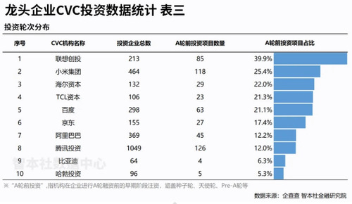 除此之外,联想创投也在“投早投小”方面表现卓著。通过分析龙头企业CVC投资轮次数据发现,联想、小米、海尔、TCL、百度5家龙头企业CVC表现突出,超过1/5的投资项目都是在企业发展早期(A轮前)进入。其中,排名第一的联想创投,近4成投资项目都是在企业A轮融资前进入,占比数据排名第一。