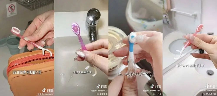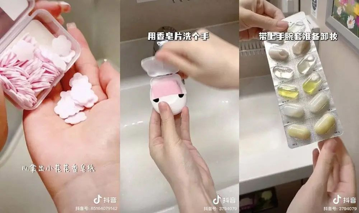 就像在同一个摄影棚拍摄同一段视频,她们也使用了同款便携式胶囊洗漱用品,同款牙线,同款手膜。