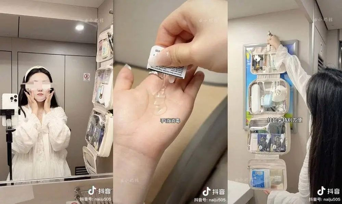 在人来人往的高铁卫生间里,精致女生们支起手机支架和专业灯光,挂起琳琅满目的化妆包,换上了可爱的睡衣睡裙,开始了漫长的洗漱表演。