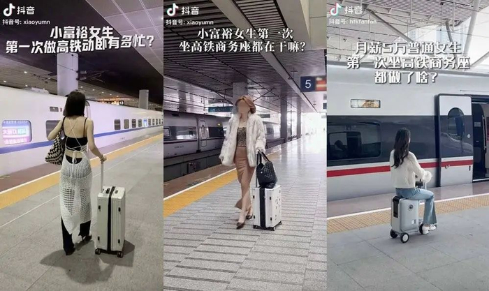 视频开场一定是高铁外景,大部分“精致女生”都是坐着同款电动行李箱出场的。