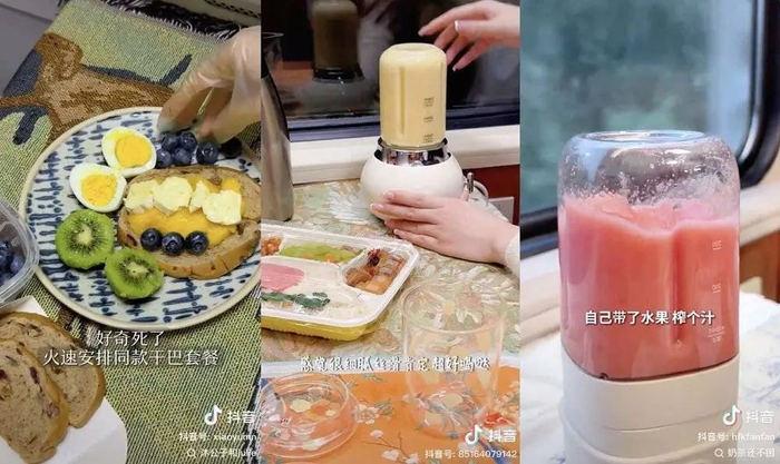 有人直接从包里变出了一整间厨房,在高铁上现做干巴lunch。配文一定少不了这句——这就是商务座的仪式感,集美们又出片啦。