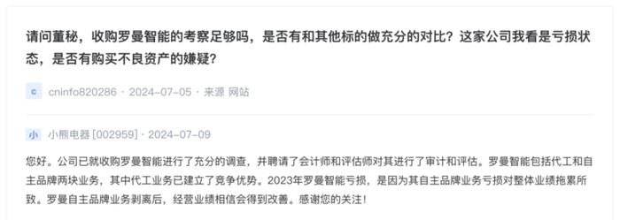 “收购罗曼智能的考察足够吗,是否有和其他标的做充分的对比?这家公司我看是亏损状态,是否有购买不良资产的嫌疑?”