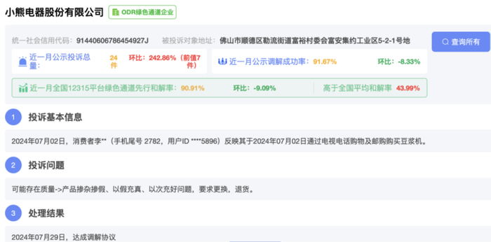 全国公示信息显示,今年7月2日,一位李姓消费者反映自己通过电视电话购物及邮购购买了豆浆机可能存在质量问题,要求小熊电器股份有限公司更换、退货。