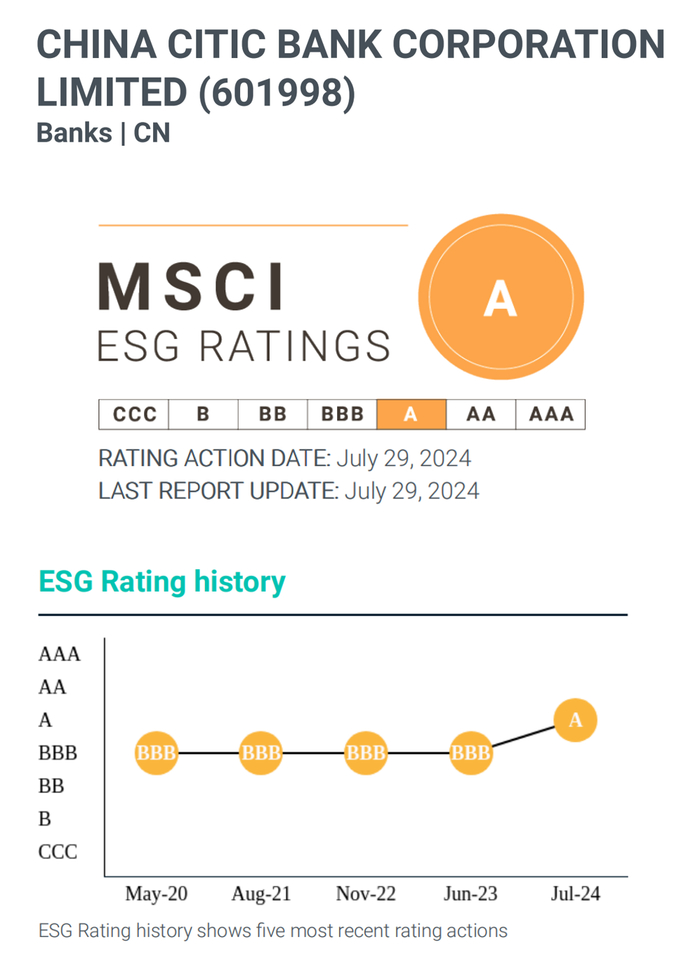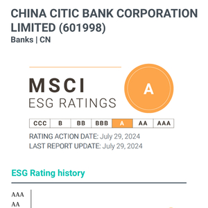 2024年7月底,国际权威评级机构MSCI(明晟)发布中信银行(601998.SH,00998.HK)环境、社会及管治(ESG)最新评级结果,评级由“BBB”上调至“A”等级。