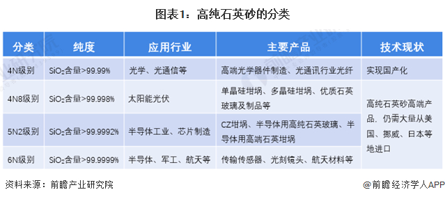 高纯石英砂指SiO2纯度较高(纯度≥99.99%,即4N)、杂质元素含量极低的石英及其产品,是硅产业高端产品的物质基础。从性能上看,高纯石英砂具有极好的化学稳定性、高绝缘耐压能力和极低的体膨胀系数,被广泛应用于新一代信息技术、新材料产业、节能环保产业等战略性新兴产业。