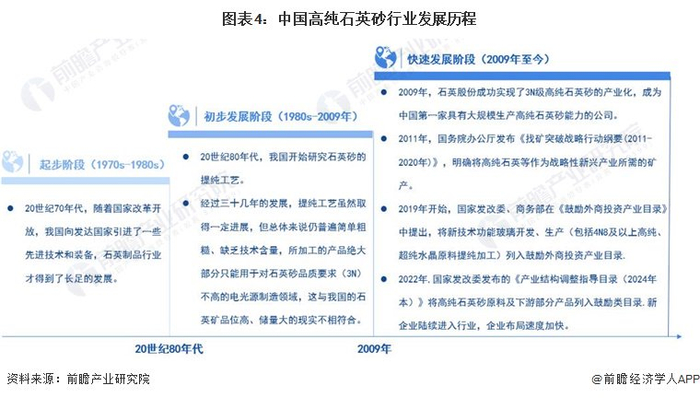 中国的石英制品工业发展较晚,20世纪70年代以后,随着国家改革开放,我国向发达国家引进了一些先进技术和装备,石英制品行业才得到了长足的发展。而20世纪80年代左右,我国才开始研究石英砂的提纯工艺,但总体来说仍普遍简单粗糙、缺乏技术含量。2009年,石英股份成为第一家成功实现了高纯石英砂产业化的中国企业,之后,我国石英砂行业进入快速发展阶段,2011年,国务院办公厅发布《找矿突破战略行动纲要(2011-2020年)》,明确将高纯石英等作为战略性新兴产业所需的矿产。2019年开始,国家发改委、商务部在《鼓励外商投资产业目录》中提出,将新技术功能玻璃开发、生产(包括4N8及以上高纯、超纯水晶原料提纯加工的提纯加工)列入鼓励外商投资产业目录;2022年国家发改委发布的《产业结构调整指导目录(2024年本)》也将高纯石英砂原料及下游部分产品列入鼓励类目录。至此,新企业陆续进入行业,布局高纯石英砂相关产品及产线建设加速。