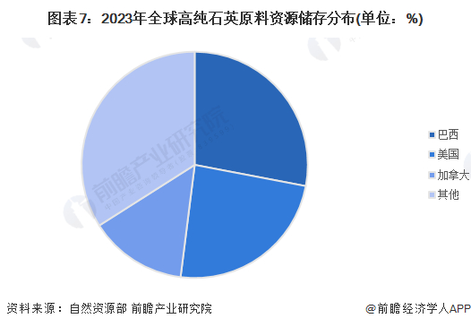 我国石英矿物资源十分丰富,但高纯石英矿床少,且规模较小,高品质脉石英仅占石英矿资源的0.93%。从全球来看,巴西是全球高纯石英资源量第一大国家,主要矿石类型为天然水晶,在全球资源量中占比28%左右;排名第二的是美国,主要矿石类型为花岗岩石英,在全球资源量中占比23%左右;加拿大位列全球第三,主要矿石类型为脉石英,占比约14%。
