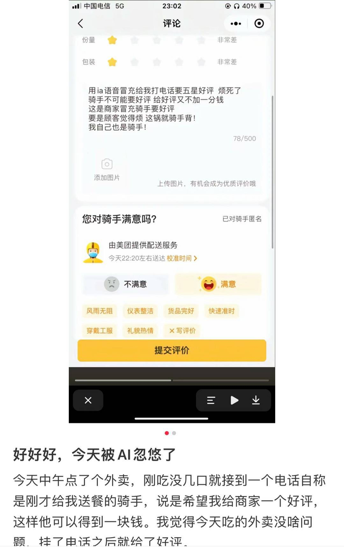 有类似遭遇的不止张芳,有人还将自己与“AI外卖小哥”的对话上传到社交平台,不少网友跟帖称也被同样方式索要过好评。“外卖要好评都请AI演员了,还有什么是真的?”