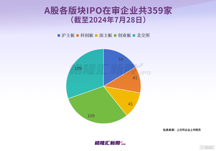 据统计,截至7月28日,A股各板块在审企业共359家,其中,上交所100家、深交所150家、北交所109家。