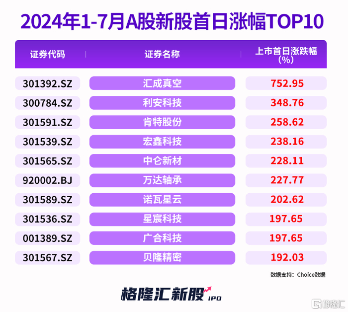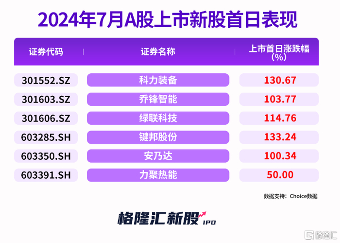 2024年7月在A股上市的6家企业上市首日全部收涨。其中,键邦股份、科力装备、绿联科技、乔锋智能、安乃达均在上市首日涨幅翻倍。