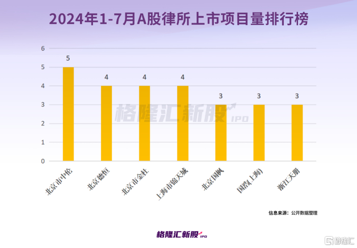 律所方面,今年前7个月登陆A股市场的50家企业中,上市项目量最多的是北京市中伦,同时北京德恒、北京市金杜、上海市锦天城并列第二。
