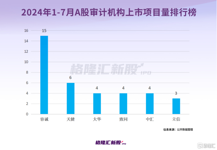 审计机构方面,今年前7个月登陆A股市场的50家企业中,容城以15家上市项目量位居榜首,天健以6家排在第二。