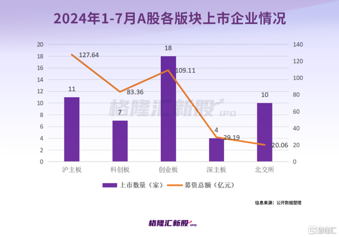 2024年1-7月,登陆A股的50家企业中,11家沪主板新股共募集127.64亿元,成为募资额最高的板块;上市新股数量最多的是创业板,共有18家企业上市。