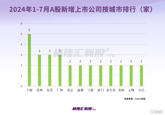 分城市来看,2024年1-7月新增A股上市公司最多的城市依然是上海,共有5家企业成功在A股上市;广州、东莞、常州分别新增3家A股上市公司,并列第二。