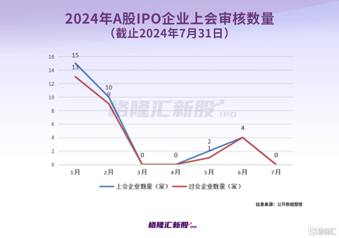 今年A股IPO企业上会审核速度也明显减缓。在6月凯普林、成电光信、太湖远大、汉朔科技这四家企业过会后,整个7月都没有企业上会。2024年1-7月A股共有31家IPO企业上会,其中过会的有27家。