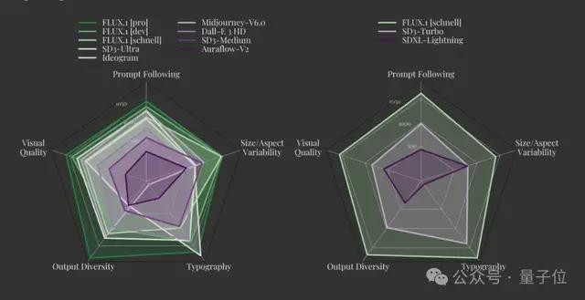 3款模型中,FLUX.1 [pro] 和 [dev] 在视觉质量、提示响应度、尺寸/长宽高比列灵活性、排版和输出多样性这些方面,超过了Midjourney v6.0、DALL·E 3(HD)和 Stable Diffusion 3-Ultra。