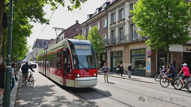提示词:弗莱堡一条美丽街道的照片,一辆有轨电车经过,人们有的散步有的骑自行车。