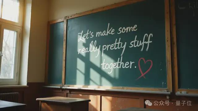 提示词:旧教室黑板的照片。黑板上用粉笔写着“let’s make some really pretty stuff together”,词后有一个红色的粉笔心。阳光从窗户照进来。