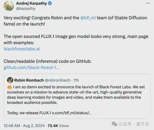 AI大牛卡帕西也在线发来贺电,还顺道称赞了一下黑森林的新模型: