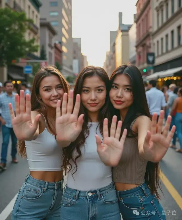 提示词:三位女士在市中心街道上拍摄的照片,她们把手伸向镜头。