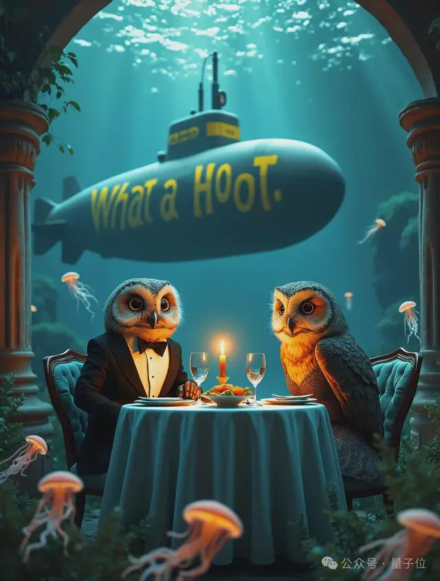 提示词:水下场景中,两只猫头鹰坐在一张精美的餐桌旁,餐桌中央点燃了蜡烛,两只猫头鹰正在一起享用一顿美味的晚餐。左边的猫头鹰穿着燕尾服,右边的猫头鹰穿着漂亮的裙子。背景中有一艘潜艇驶过,其侧面画有“What a Hoot”字样。桌子下面的图像底部有小水母在游动,电影般美丽的数字艺术品。
