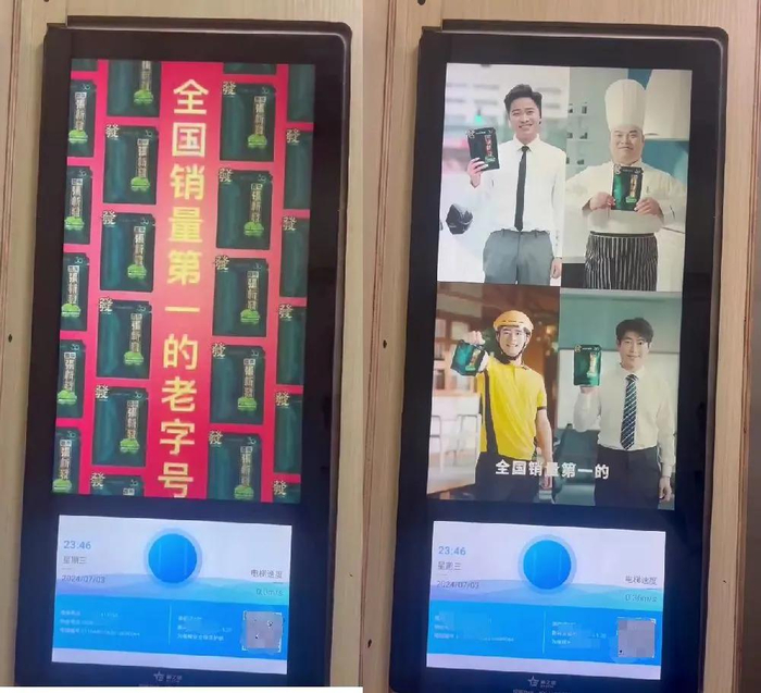 《消费者报道》记者观察发现,在张新发的线上渠道中,其文案大多以“老字号”“工艺”“味道”等方面宣传产品。但在线下电梯广告里,则堂而皇之地宣传其“销量第一”。