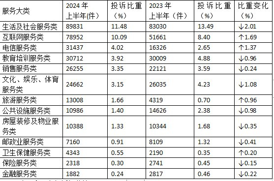 根据2024年上半年服务大类投诉数据(如图3、表3所示),生活及社会服务类、互联网服务类、电信服务类、教育培训服务类、销售服务类居前五位。与2023年上半年相比,互联网服务类、电信服务类、旅游服务类投诉量比重上升,生活及社会服务类,文化、娱乐、体育服务类,公共设施服务类投诉量比重下降。