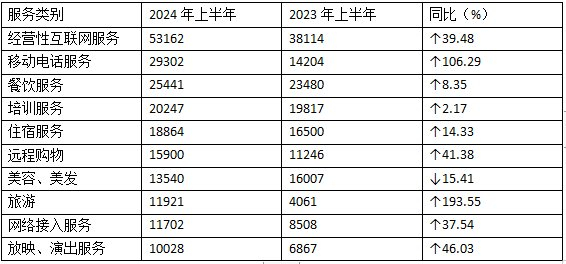 在具体服务投诉中,投诉量居前五位的分别为(如图5所示)经营性互联网服务、移动电话服务、餐饮服务、培训服务、住宿服务。与2023年上半年相比,旅游、移动电话服务投诉量显著上升,美容、美发服务投诉量下降。