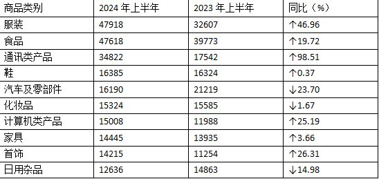在具体商品投诉中,投诉量居前五位的分别为(如图4所示):服装、食品、通讯类产品、鞋、汽车及零部件。与2023年上半年相比,通讯类产品、服装、首饰投诉量上升,汽车及零部件、日用杂品投诉量下降。