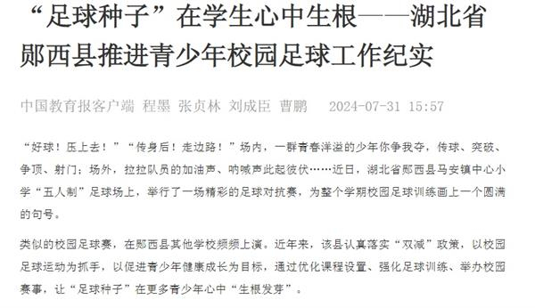7月15日,十堰日报社教育周刊以《“足球种子”在孩子心中“生根发芽”》为题,对郧西县校园足球亮点工作进行专题报道。此报道受到中国教育报关注,并于8月1日进行报道。原文如下: