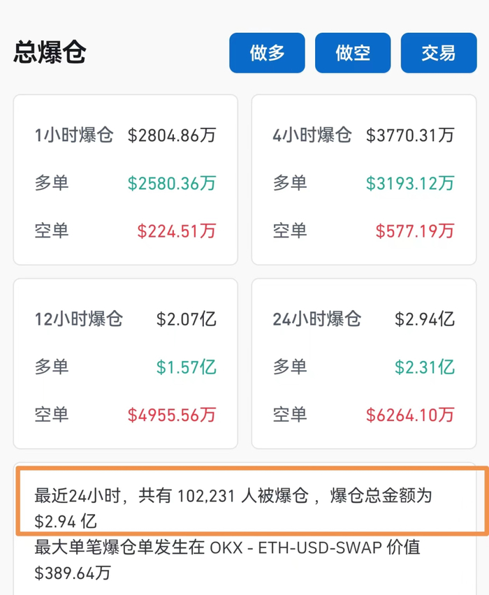 剧烈波动的价格,又导致不少人爆仓。据coinglass数据,过去24小时内,加密货币市场爆仓总人数达到10.22万人,爆仓总金额为2.94亿美元,其中近八成为多单爆仓。