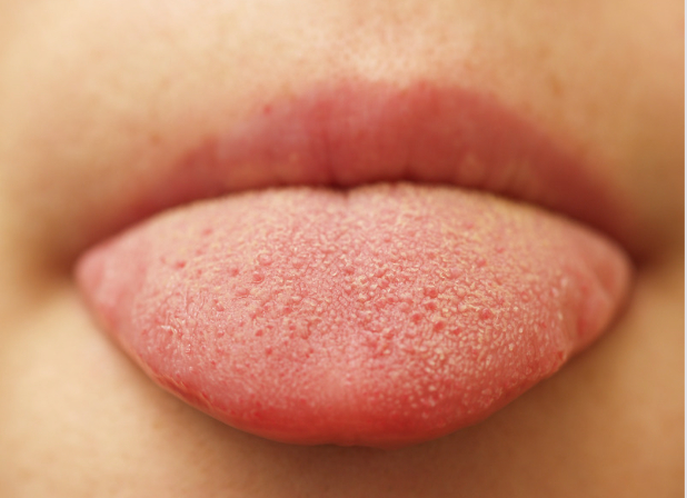 舌苔厚腻,起床漱口前自然伸舌对镜观察,看舌面如有一层油腻样厚厚苔质,刮之不去即为湿气重特征表现。