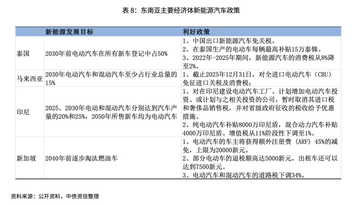 贸易政策方面,2022年中国与东盟《区域全面经济伙伴关系协定》(RECP)正式生效,包括汽车及零部件在内的享惠产品得到了东盟各国在开放市场、取消关税等方面的优惠待遇,如泰国对中国出口新能源汽车实行免关税,马来西亚对全进口电动汽车免征进口关税和消费税。同时为了吸引国外投资和促进本国就业,东盟各国对于车企在当地投资设厂也提供了包括补贴、免税在内的多项支持,中国新能源汽车对东南亚出口和属地化生产均具备较高的便利性。