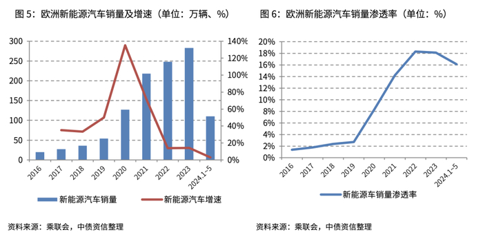 短期看,2023年以来包括德国、英国在内的部分欧洲国家下调了新能源汽车在销售层面的补贴,补贴变动带来的消费提前效应透支了后期需求,叠加欧洲经济增速放缓,欧洲新能源汽车销量增速呈现下降趋势,2024年1~5月欧洲新能源汽车销量增速由2023年的14%降至3%,渗透率亦阶段性的出现小幅下滑(至16.1%),预计上述因素的影响仍将持续一段时间。