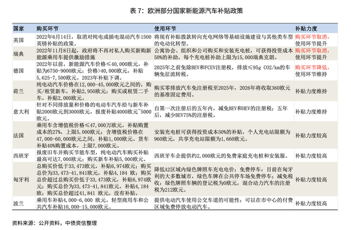 正如前文所述,我国新能源汽车出口规模持续增长,自主品牌成为新能源汽车出口主力,下文将进一步探讨中国品牌新能源汽车的出口潜力(不考虑特斯拉等国外品牌在华生产的出口)。考虑到全球各地区新能源汽车发展尚不均衡,我国新能源汽车所面临的贸易政策、相对竞争力等因素亦不相同,因此下文将对我国新能源汽车在欧洲、东南亚以及其他市场的出口前景分别进行分析。