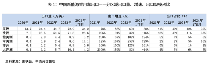 (1)亚洲市场方面,除日本和韩国外,多数亚州国家汽车市场无强势本土品牌,成为我国新能源汽车出口的第一大目的地。我国新能源汽车出口亚洲的占比稳定在40%左右,2023年和2024年1~5月对亚洲出口规模分别为72.9万辆和34.2万辆,销量增速分别为63.09%和38.35%,在前期高基数下仍保持了较高的增速水平,韧性较强。具体出口国家方面,泰国、菲律宾、阿联酋、印度的出口规模排名前4位,此外对越南、马来西亚、乌兹别克斯坦的出口量亦呈现较快增长。