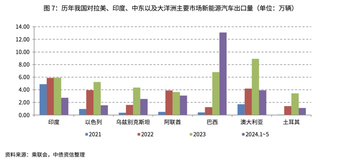 (4)具体国家方面,目前我国新能源汽车出口国家较为分散,2024年1~5月,对最大单一出口目的国巴西的出口占总出口量的比重约为15%,前十大出口目的国的出口占比为66%,2023年全年出口量超过2万辆的国家有21个,整体看对单一市场的依赖度不高,出口目的地的分散化有利于抵御个别地区的出口风险。