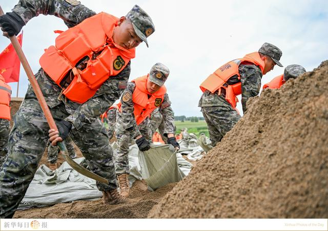 8月2日,武警内蒙古总队通辽支队官兵在东辽河大堤上装沙袋封堵渗漏点。为应对东辽河汛情,内蒙古通辽市科尔沁左翼后旗双胜镇有序引导1.9万余名群众转移,积极组织防汛力量对大堤进行除险加固,全力以赴防汛情。