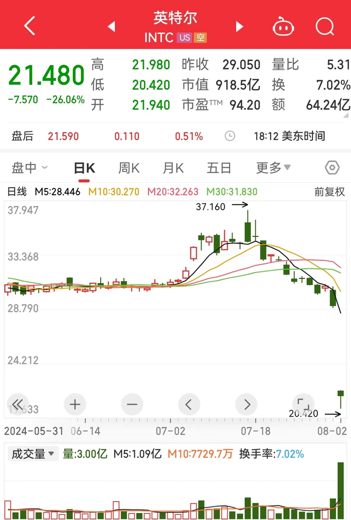 大型科技股多数下跌,英特尔大跌逾26%,市值一夜蒸发324亿美元(约合人民币2320亿元)。