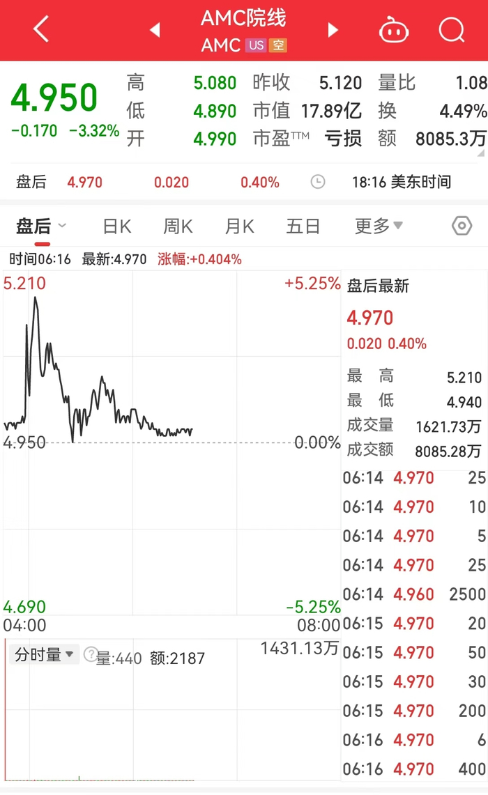 AMC院线美股盘后一度涨超4%。MC院线第二财季调整后每股亏损0.43美元,分析师预期亏损0.50美元;第二财季营收10.3亿美元,符合分析师预期;第二财季调整后息税前利润为2940万美元,分析师预期1700万美元。
