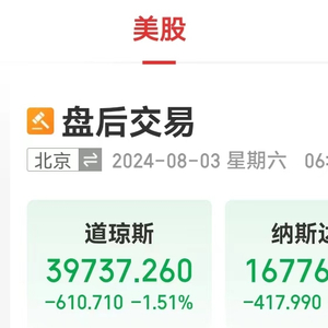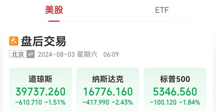 当地时间8月2日,美股三大指数集体收跌,纳指跌2.43%;标普500指数跌1.84%;道指下跌610.71点,跌幅1.51%。其中,纳指、标普500指数连跌三周。KBW银行指数下跌4.3%,为2023年5月以来最大跌幅。